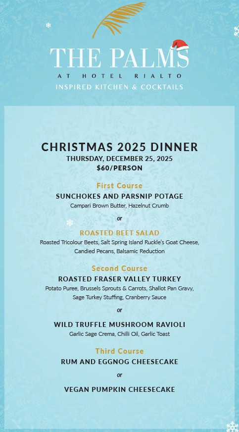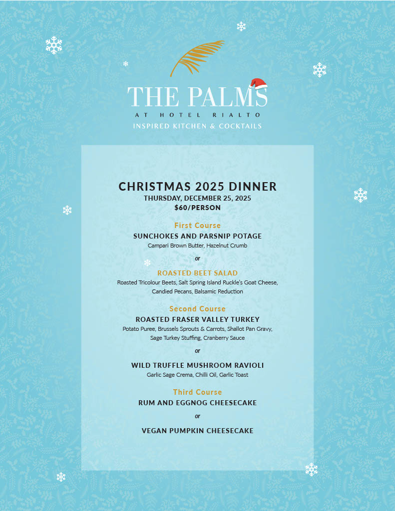 Join us Thursday, December 25th for a festive three-course dinner featuring Fraser Valley turkey with all the trimmings, wild truffle mushroom ravioli, and housemade cheesecake.